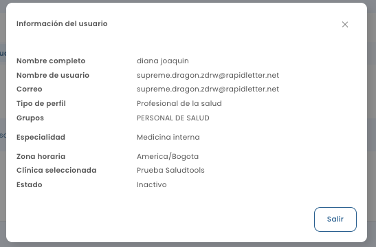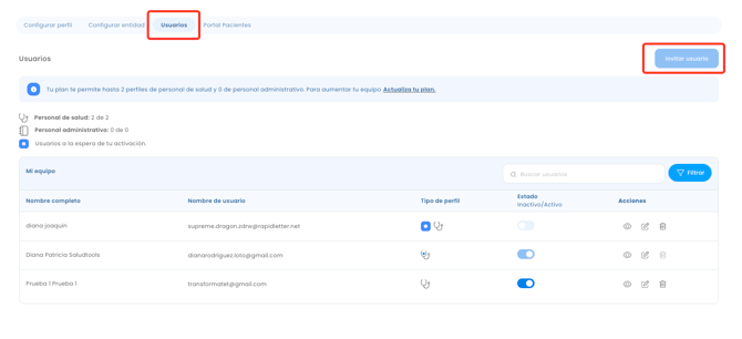 - Estado: Con este botón podrás activar o inactivar un usuario. Recuerda que al inactivarlo, este no podrá acceder a la plataforma de Saludtools. La información anteriormente registrada y creada por este usuario, no se modificará o eliminará del sistema.