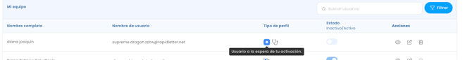 Ícono "i" azul: Usuario a la espera de activación. Esto sucede cuando tienes una cantidad de usuarios permitidos en tu plan y deseas agregar uno adicional inactivo, de tal manera, que para activarlo deberás inactivar un usuario ya existente o solicitar un usuario adicional en tu plan.