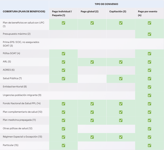 La siguiente tabla detalla las combinaciones permitidas entre los diferentes tipos de convenios y los planes de beneficios o coberturas en Saludtools. Una ✅ indica una combinación válida.