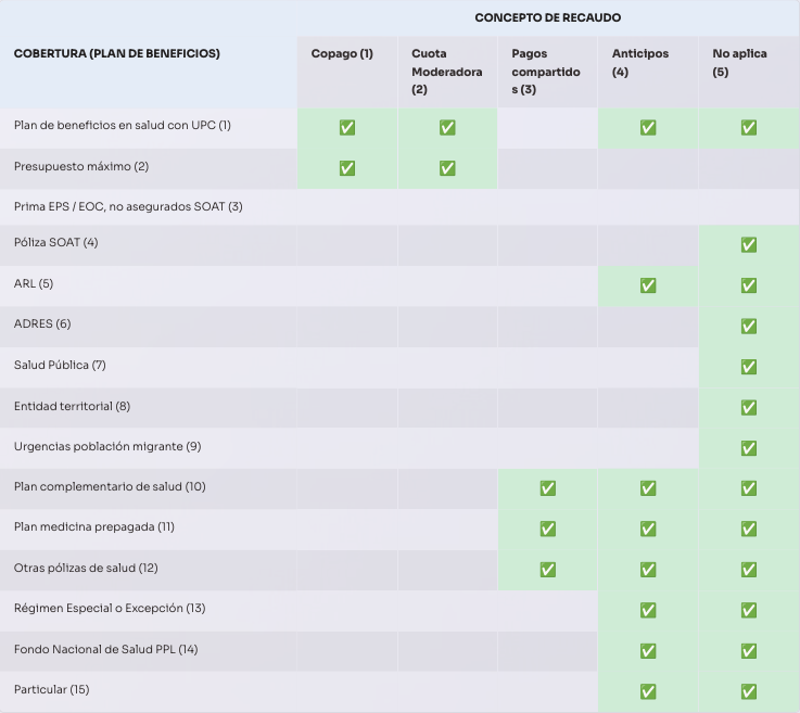 El concepto de recaudo (anticipo) registrado en el cargo de Saludtools debe corresponder con el tipo de cobertura o plan de beneficios. A continuación, se muestra una tabla con los conceptos de recaudo válidos para cada cobertura.