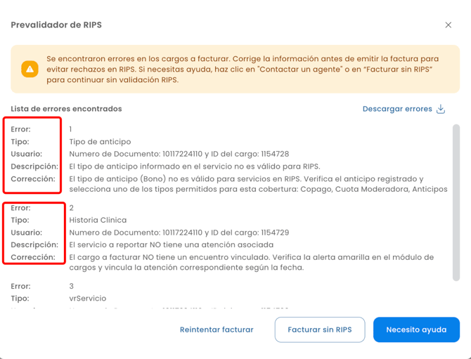 El sistema detecta información que puede generar errores en los RIPS